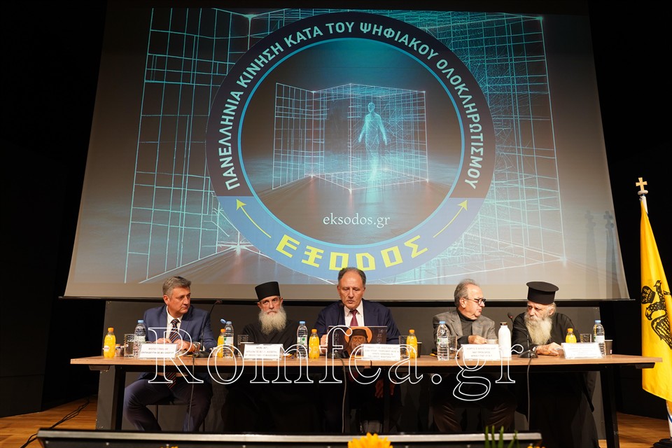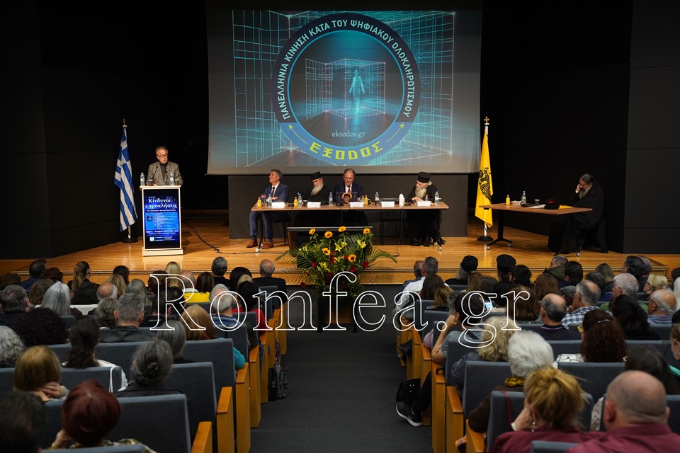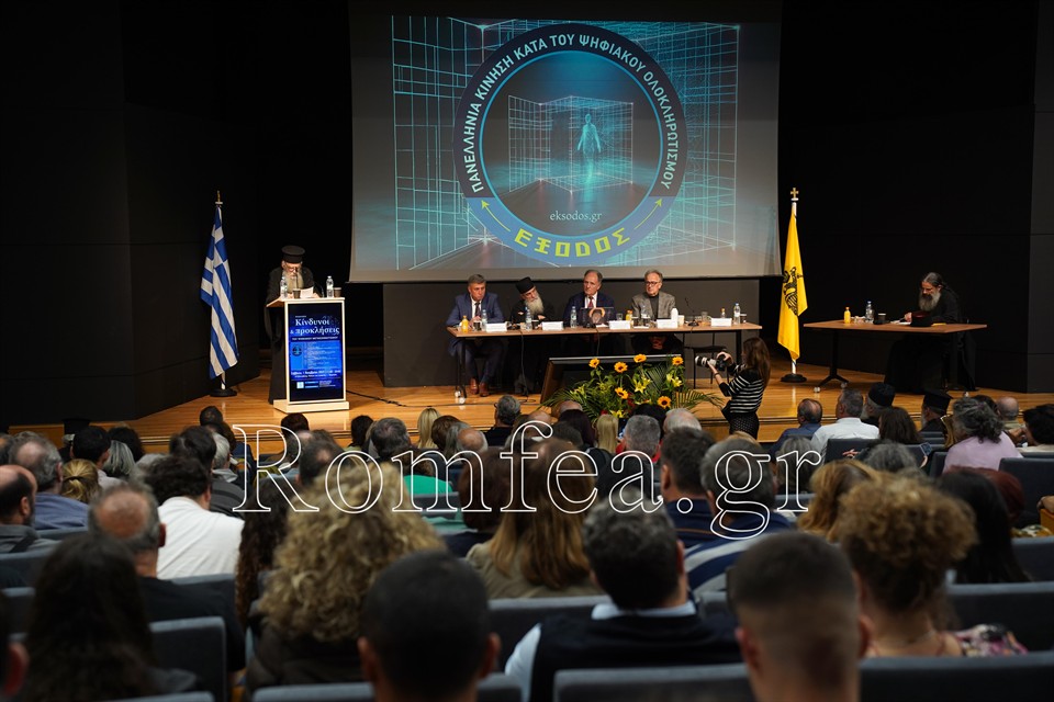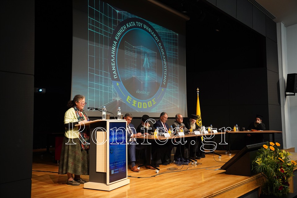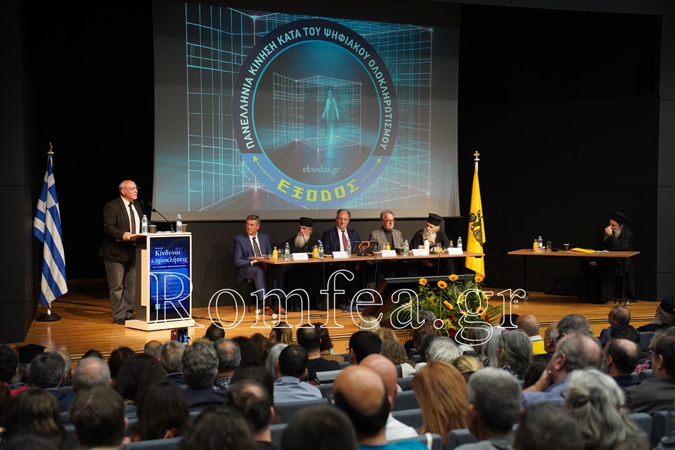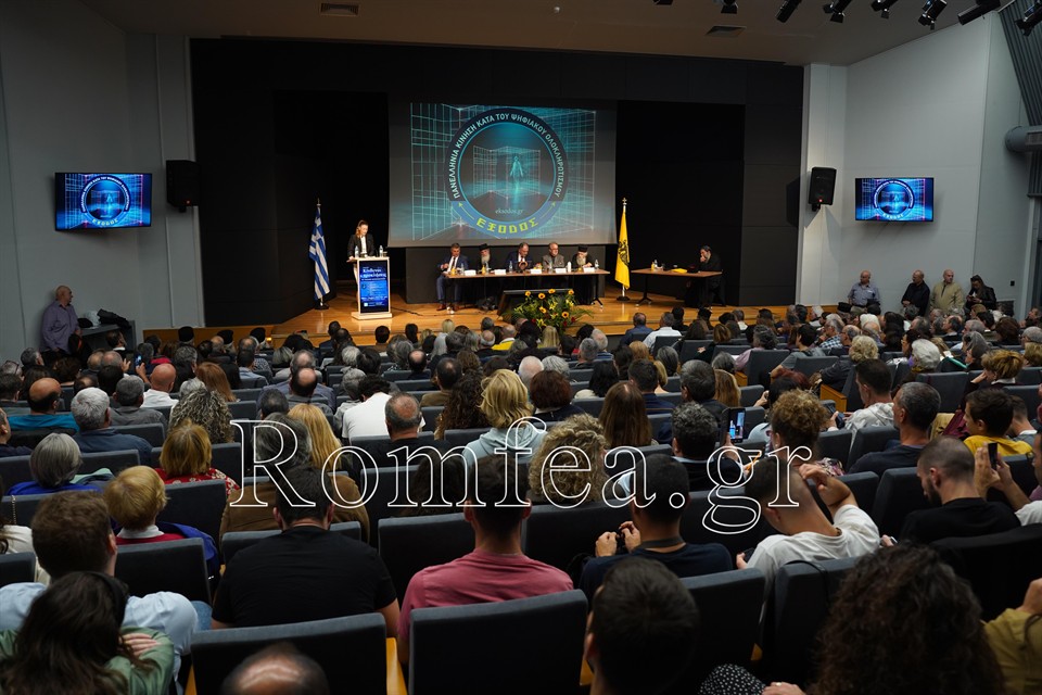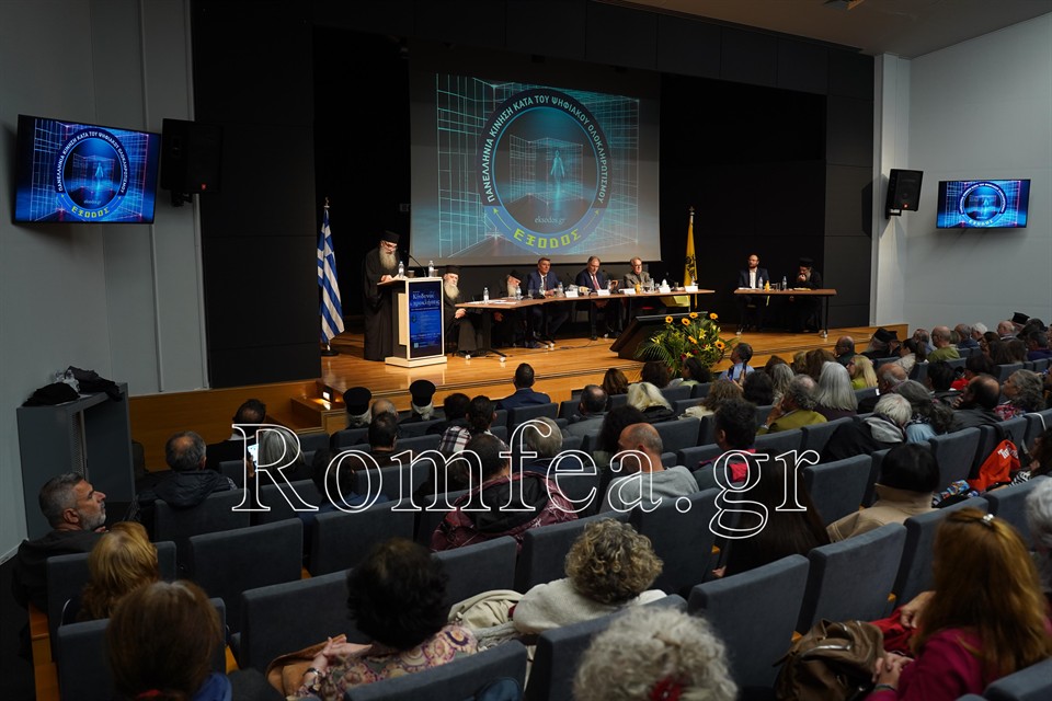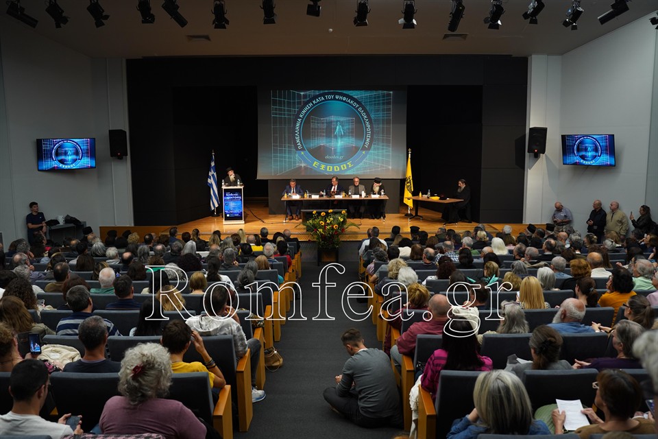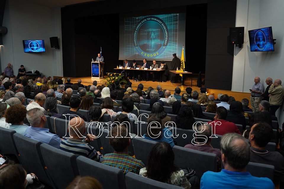 Με συμμετοχή πλήθους κόσμου που γέμισε ασφυκτικά την αίθουσα, οι εισηγητές παρουσίασαν με τεκμηριωμένο λόγο τους πνευματικούς και κοινωνικούς κινδύνους που κρύβονται πίσω από τον καθολικό ψηφιακό μετασχηματισμό του Κράτους, εναντίον του οποίου η «ΕΞΟΔΟΣ» διεξάγει συλλογή υπογραφών.
