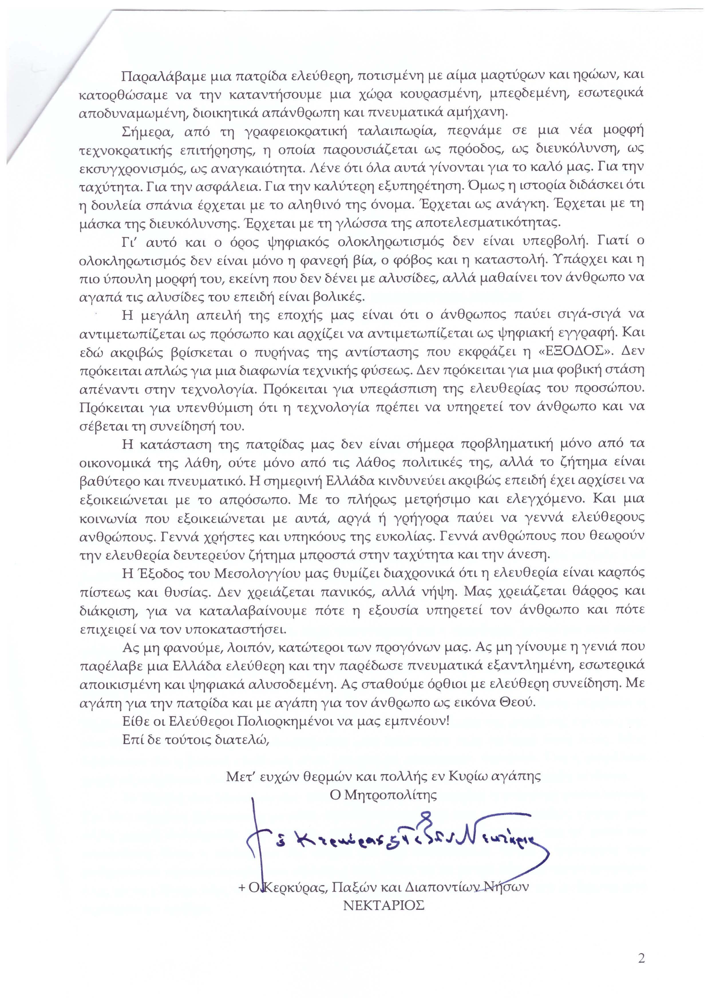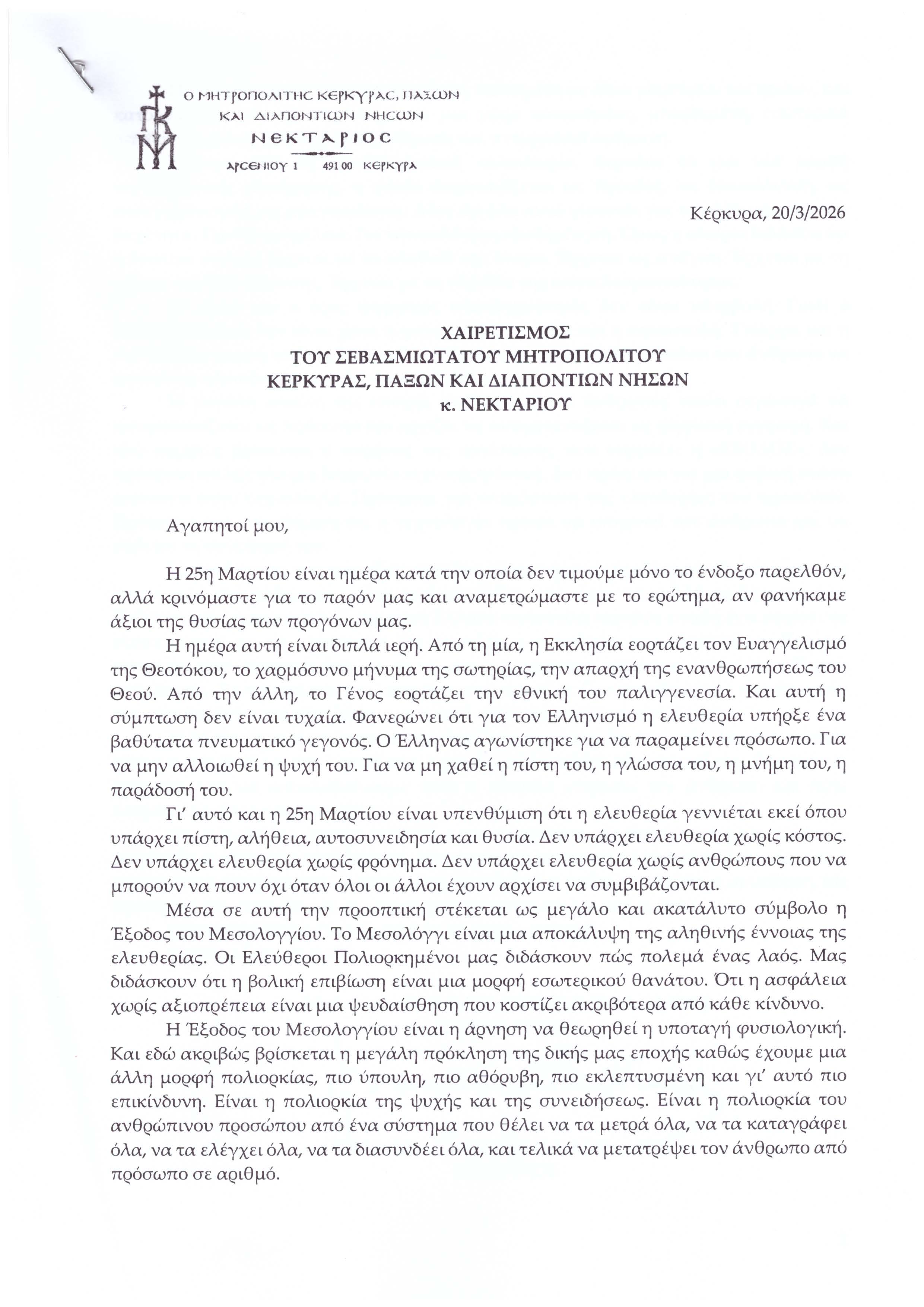 Χαιρετισμός Μητρ. Κερκύρας κ.κ. Νεκταρίου στην εκδήλωση με θέμα: Τὰ «Σημεῖα τῶν Καιρῶν» καὶ ἡ Εὐθύνη μας
